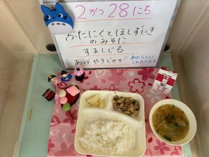 今日の献立は、豚肉と干しずいきのみそ煮、すまし汁、あげ焼きじゃがです。