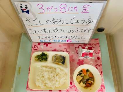 今日の献立は、さごしのおろしじょうゆかけ、さといもと野菜の含め煮、菜の花のおひたしです。