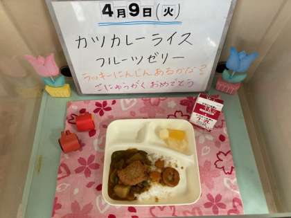 今日の献立は、カツカレーライス、フルーツゼリーです。