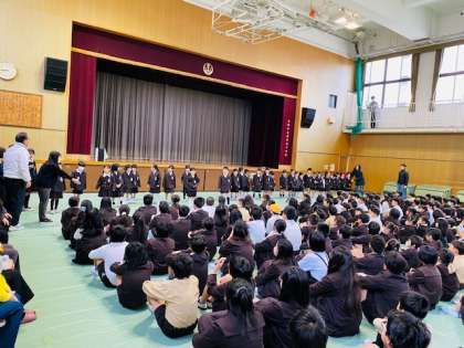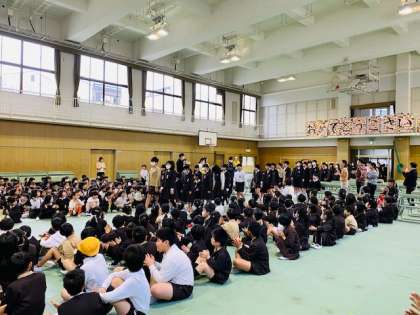 2年生から6年生の子どもたちが講堂に集まり、1年生の子どもたちを迎えて対面式を行いました。