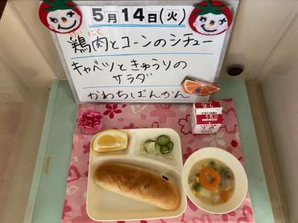 今日の献立は、鶏肉とコーンのシチュー、キャベツときゅうりのサラダ、かわちばんかんです。