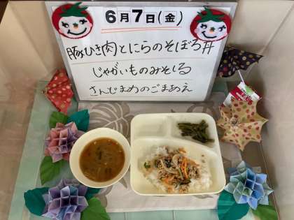 今日の献立は、豚ひき肉とにらのそぼろ丼、じゃがいものみそ汁、さんどまめのごまあえです。