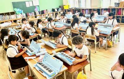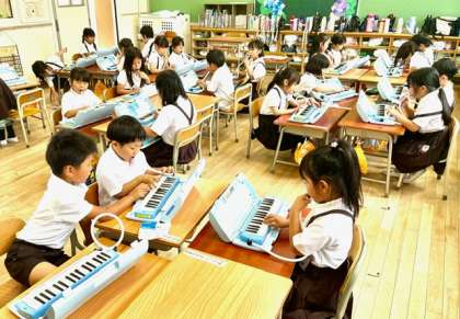 班の友達と互いに教え合って、素敵なメロディーを演奏しています♪