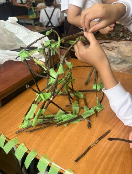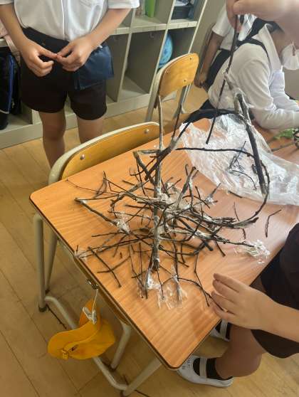 全校遠足の際に、公園で拾って帰ってきた木の枝を使って、図工の造形遊びである「つなぐんぐん」という単元をしました。木の枝の形から「これはギターになりそう!」「机と机を繋ぐ橋が作れそう!」など色々想像し、友だちと協力しながら楽しんで作りました。子どもたちの想像力の豊かさを感じました。