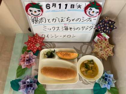今日の献立は、鶏肉とかぼちゃのシチュー、ミックス海そうのサラダ、クインシーメロンです。