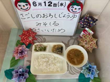 今日の献立は、さごしのおろしじょうゆかけ、みそ汁、野菜いためです。