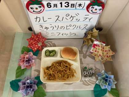 今日の献立は、カレースパゲッティ、きゅうりのピクルス、ミニフィッシュです。