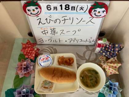 今日の献立は、えびのチリソース、中華スープ、ヨーグルトです。