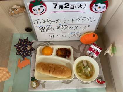 今日の献立は、かぼちゃのミートグラタン、鶏肉と野菜のスープ、みかんです。
