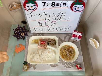 今日の献立は、ゴーヤチャンプルー、かつおぶし、五目汁、あげ焼きじゃがです。