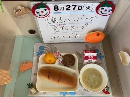 今日の献立は、焼きハンバーグ、ケチャップ、豆乳スープ、みかんです。