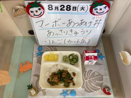 今日の献立は、マーボーあつあげ丼、あっさりきゅうり、りんごです。