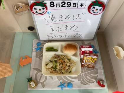 今日の献立は、焼きそば、えだまめ、おさつチップスです。