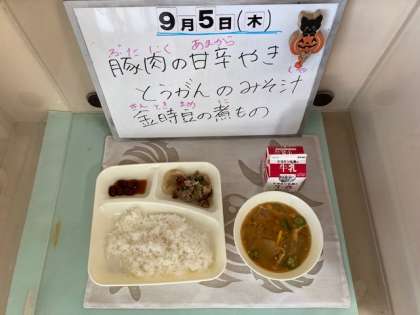 今日の献立は、豚肉の甘辛焼き、とうがんのみそ汁、金時豆の煮ものです。