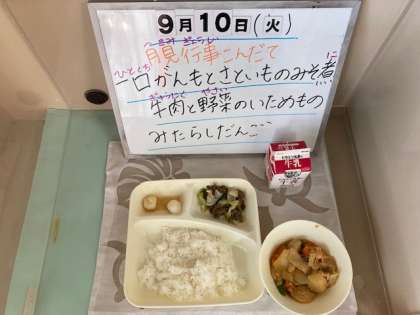 今日の献立は、一口がんもとさといものみそ煮、牛肉と野菜のいためもの、みたらしだんごです。