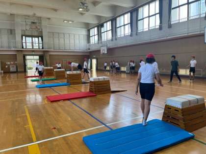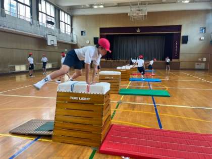 跳び箱運動では、友だちの上手な跳び方を話し合いながら練習しています。