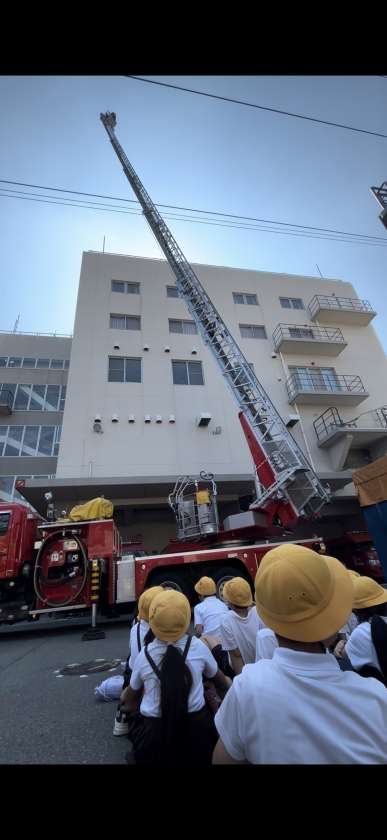此花消防署へ見学に行きました。 普段は身近で見ることのできない、消防士の方の服装や装備を見せていただいたり、実際に持たせていただいたりしました。
