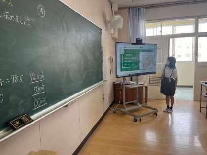 今まで学習した円、三角形、正方形の面積の公式を使って、ラグビーボールのような形の面積を求める学習をしました!!友だちと話し合いながら、面積を求め方を考えることができましたね!