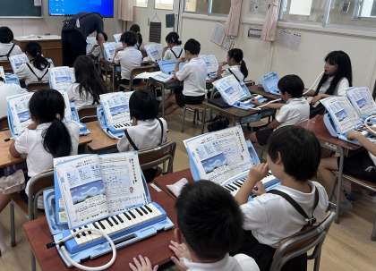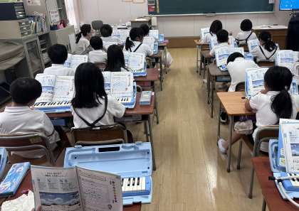 歌を歌うグループと鍵盤ハーモニカを弾くグループに分かれて学習しています。