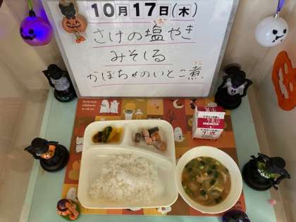 今日の献立は、和風ハンバーグ、みそ汁、かぼちゃのいとこ煮です。