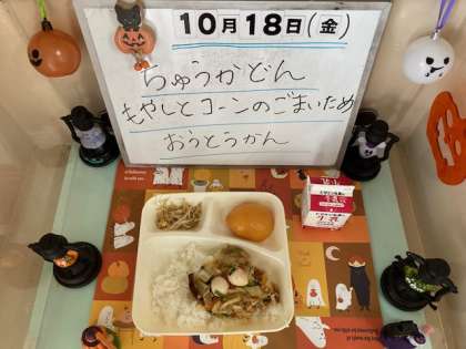 今日の献立は、中華丼、もやしとコーンのごまいため、黄桃です。