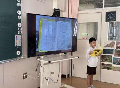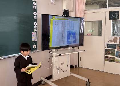 「ビーバーの大工事」の学習で見つけたビーバーのひみつのように、自分が調べたい動物のひみつを「どうぶつカード」にまとめ、発表しました。