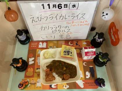 今日の献立は、えびフライカレーライス、カリフラワーのピクルス、いり黒豆です。