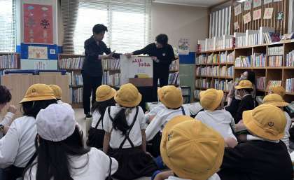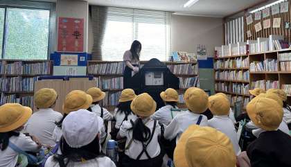 司書の方に図書館に関する手作りの紙芝居の読んでいただきました。その後、ボランティアの方に大型絵本を2冊読み聞かせをしていただきました。いつも読んでいる絵本が大きくなって、みんなとても興味津々でした!