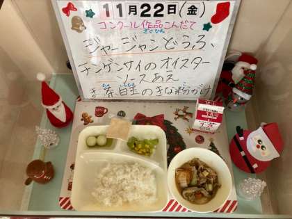 今日の献立は、ジャージャンどうふ、チンゲンサイのオイスターソースあえ、まっ茶白玉のきな粉がけです。