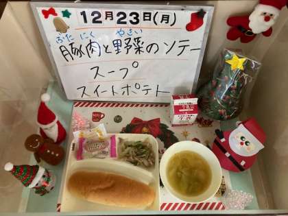今日の献立は、豚肉と野菜のソテー、スープ、スイートポテトです。
