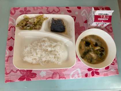 今日の献立は、さごしのしょうゆだれかけ、みそ汁、キャベツの赤じそあえです。