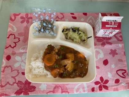 今日の献立は、ハヤシライス、キャベツのひじきドレッシング、ミニフィッシュです