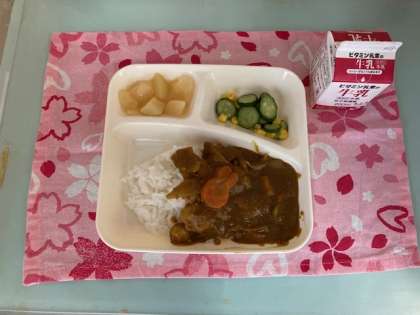 今日の献立は、チキンレバーカレーライス、きゅうりとコーンのサラダ、洋なしです。