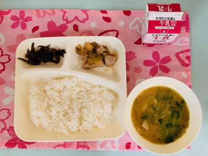 今日の献立は、まぐろの甘辛焼き、豚汁、くきわかめのつくだ煮です。