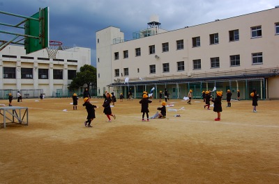 本日の5時間目に運動場で1年生がたこあげをしました。