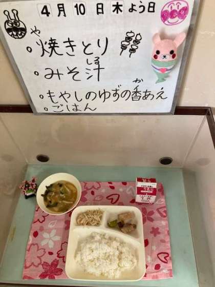 今日の献立は、焼きとり、みそ汁、もやしのゆずの香あえです。