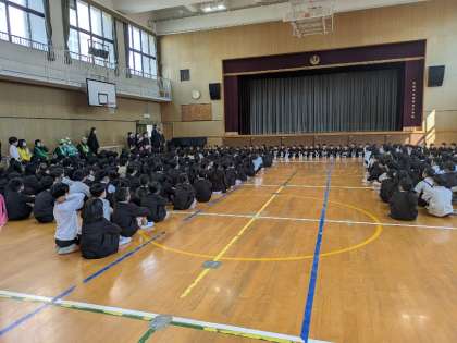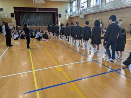 4月9日(水)、入学してきた1年生との対面式がありました。6年生が1年生と一緒に体育館へ入場しました。