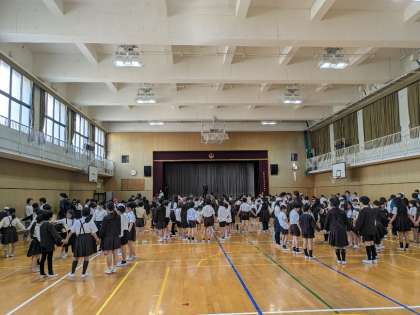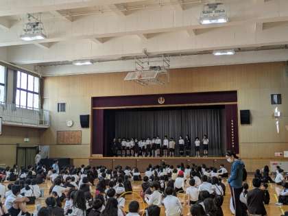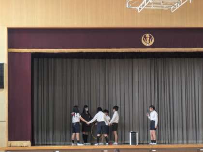 4月30日(水)、児童集会がありました。今年、初めての集会で、自己紹介をしたあと、フラフープを使って仲間づくりをしました。
