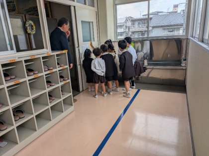 5月9日(金)、1年生は各班に分かれて学校探検をしていました。2年生が一緒に校内をまわりました。
