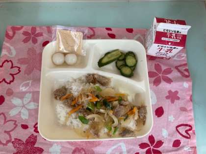 今日の献立は、豚丼、きゅうりのかつお梅風味、白玉だんご、きな粉です。