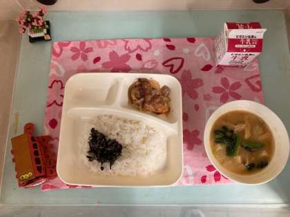 鶏肉の甘辛焼き、みそ汁、魚ひじきそぼろです。