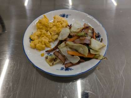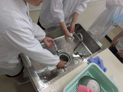 6月5日(木)、6年2組は家庭科で調理実習をしていました。ハム入り野菜炒めとスクランブルエッグを作りました。