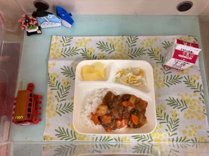 今日の献立は、ハヤシライス、キャベツとコーンのサラダ、りんごです。