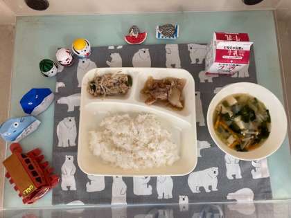 今日の献立は、豚肉のしょうが焼き、五目汁、ツナと野菜のいためものです。
