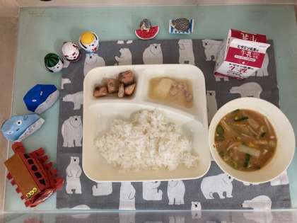 今日の献立は、さけのつけ焼き、みそ汁、とうがんの煮ものです。