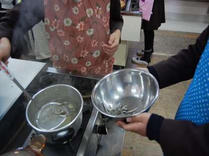 吸水の時、米の膨らみ具合に気づいた児童は「あ、大きくなった」と言ってました。また、ご飯の鍋が沸騰してきたら、「むっちゃ泡が大きい」などとしっかり観察しているようでした。