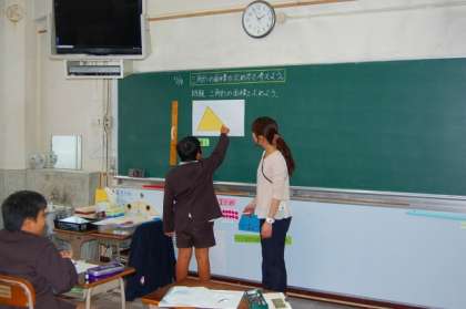 今日は、なかよし学級で算数の学習に5年生が取り組みました。三角形の面積の求め方について、試行錯誤しながら一生懸命に考えている子どもたちが印象的でした。
