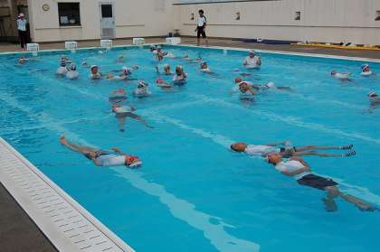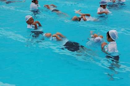 15日、曇り空のもと、1,2,5年生が着衣泳を体験しました。