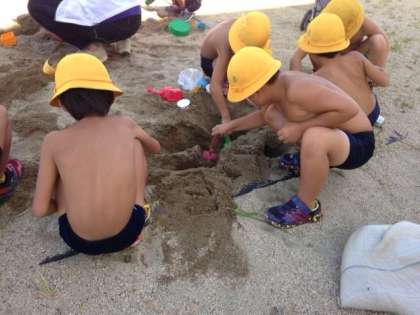 本日2時間目に、砂場で泥んこ遊びをおこないました。穴を掘ったり、団子を作ったりして、思い思いに楽しんでいました。