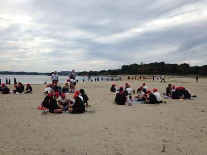 バスに乗って出発し、昼にはシーカヤックをする浜に到着し、お弁当を食べました。
